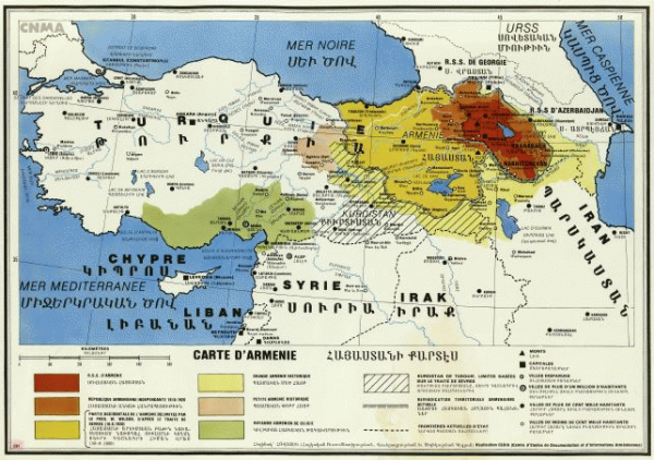 Carte d'Arménie illustrant l'évolution de ses frontières au moyen-orient depuis l'antiquité jusqu'à nos jours avec le tracé du Traité de Sèvres et l'étendue des revendications actuelles.
