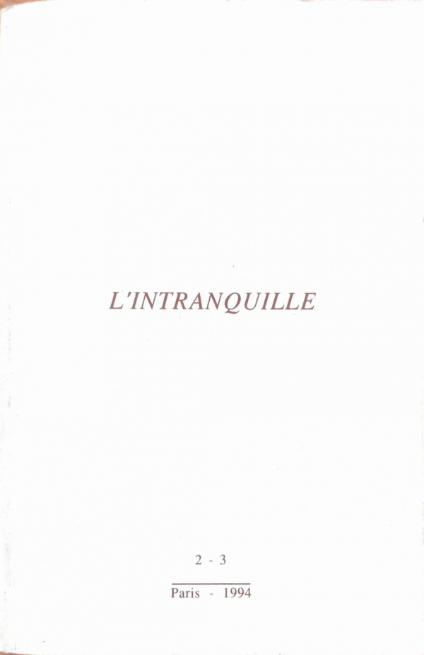"L'Intranquille : Une libre contribution à la critique de la servitude" est une revue fondée en 1992 par Philippe Bouchereau et Frosa Pejoska, qui a été publiée jusqu'en 2001. Cette publication se consacre à l'analyse et à la critique des phénomènes de servitude et de désappartenance dans les sociétés contemporaines. Les articles abordent des sujets variés, notamment les droits humains, les conflits internationaux et les mouvements sociaux.