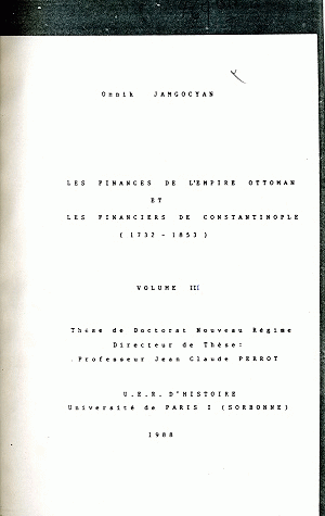 Les finances de l'Empire Ottoman et les financiers de Constantinople (1732-1853) : Troisième Partie: La vie quotidienne d'un Sarraf : Thèse de Doctorat Nouveau Régime / Onnik Jamgocyan ; [dir.] Jean-Claude Perrot, Volume 3 Publication:Paris : Université Paris I Sorbonne, 1988Description : 1 vol. (343p.) ;